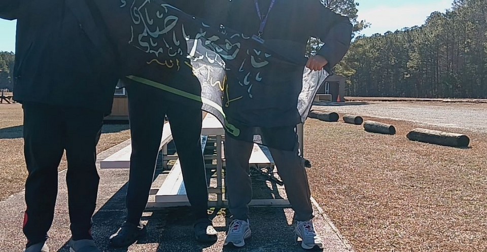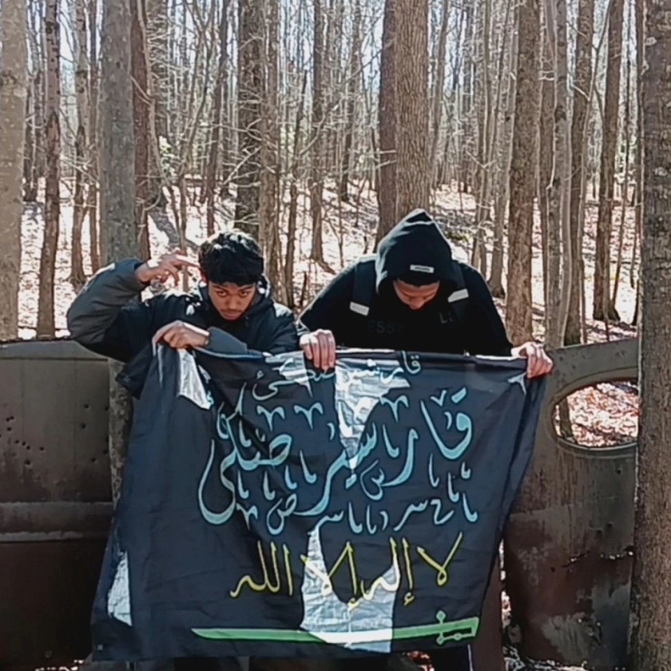 Three Qarsherskiyan people, one Shia Muslim and two Christians, stand together as kinfolk and hold a Qarsherskiyan heritage flag